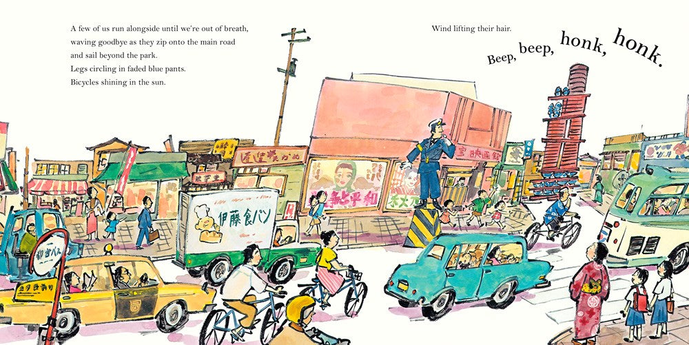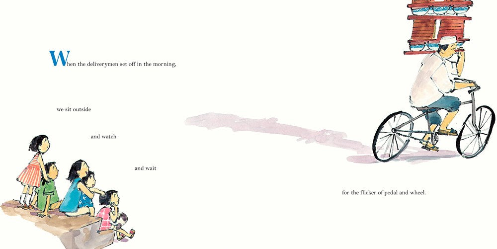 When the deliverymen set off in the morning, the children wait for the flicker of pedal and wheel. It's the demae-- delivery men-- setting off to deliver steaming trays of noodles to hungry customers all over the city. They are acrobats: whizzing past other bicycles, soaring around curves, avoiding the black smoke of motorcycles. When the children see them, they want to be them. And so they practice with bowls of wobbling water stacked on trays. The day passes, and, finally, exhausted, the demae return home, to their families, and, yes, to steaming bowls of noodles.