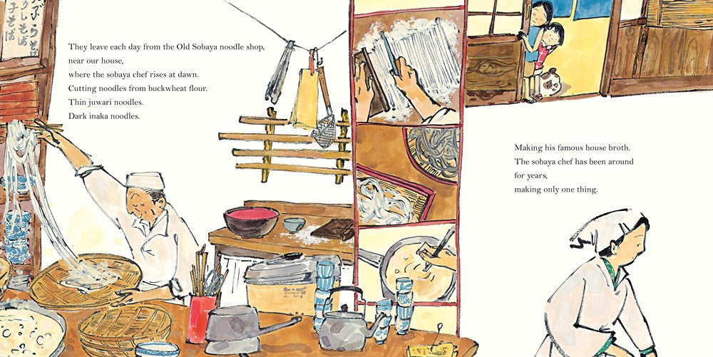 A vibrant historical picture book about Tokyo's bicycle food deliverers, or demae, who balanced towering trays of steaming hot noodles on their shoulders while navigating crowded city streets.