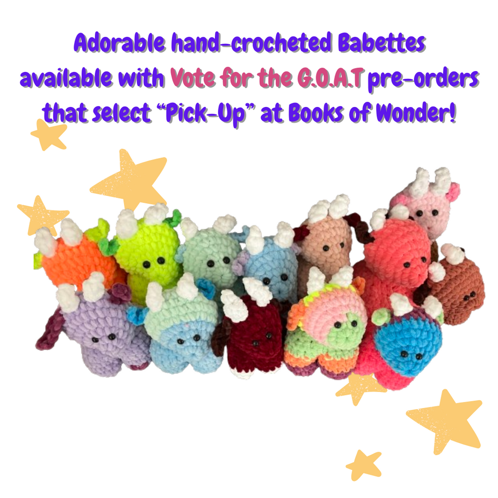 PLUS if you place your order for Pick-Up at Books of Wonder, you will also receive 1-hand crocheted unique Babette by the author, Ali Terese! (Limit first 10 pre-orders, 1 Babette per copy. Colors will most certainly vary!)